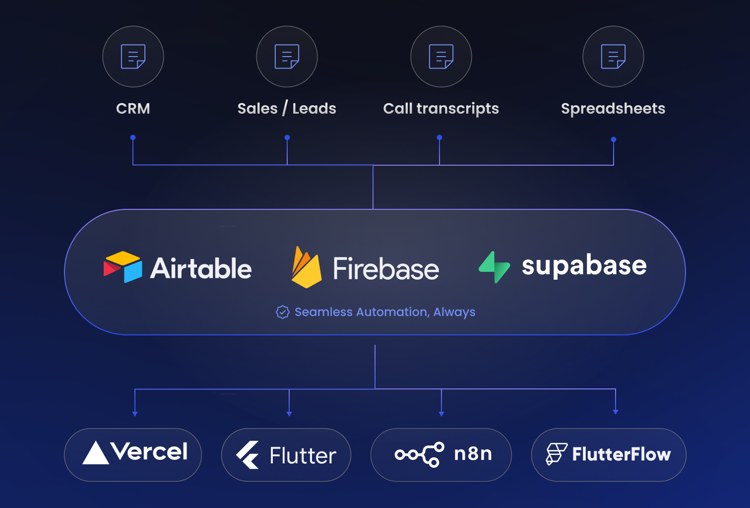 Hiring and managing an in-house team takes time, money, and overhead. By working with us, you get immediate access to a cross-functional team with expertise in no-code, low-code, custom dev, and AI workflows — without the recruitment delays.