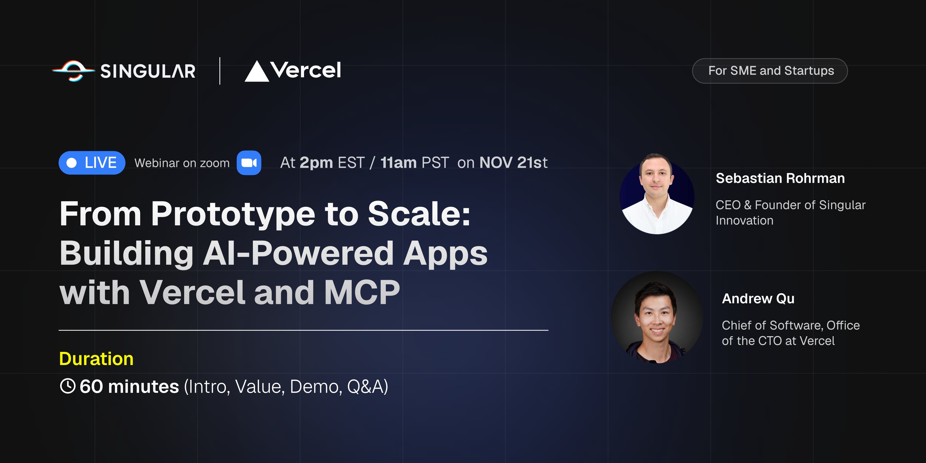 Join Andrew Qu from Vercel and Sebastian Rohrman from Singular Innovation on November 21st, 2025, at 11 AM PST (2 PM EST) for a 60-minute live session on how to build and scale AI-powered apps. Discover how MCP + Vercel unlock a faster, more conversational way to interact with business software.